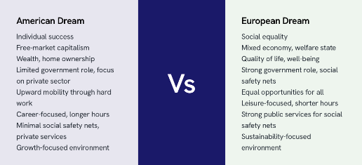 - European Dream: Prioritizes collective well-being, strong social welfare systems, and sustainability.