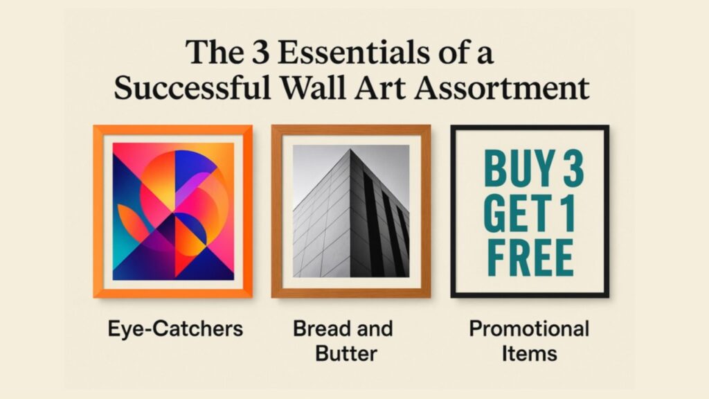 When you combine all three — the eye-catchers, the bread-and-butter, and the promotional surprises — you create an assortment that’s not only visually balanced but commercially effective. Like a well-dressed store that uses show windows, essential staples, and tempting sales to draw people in and keep them coming back, your wall art collection can do the same.